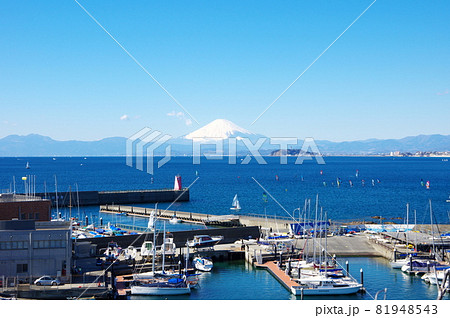 あぶずり港(鐙摺港)越しに冬晴れの富士山と江の島を望む(神奈川県葉山町)