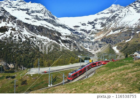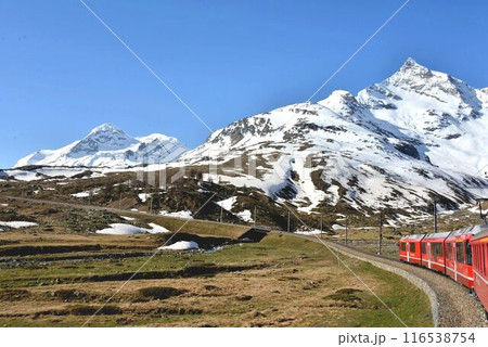 残雪が目立つ地域をのんびりと走るベルニナ線の列車