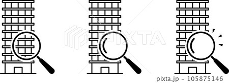 虫眼鏡とマンションの線画アイコン(モノクロ)