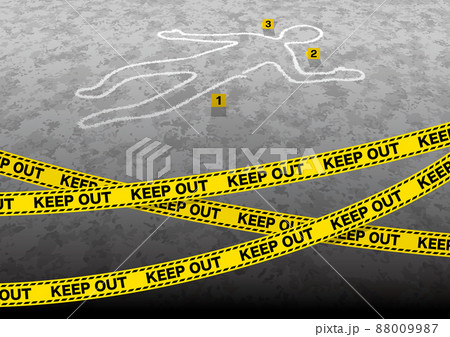 KEEP OUTのテープとチョークで描かれた人型 事件現場