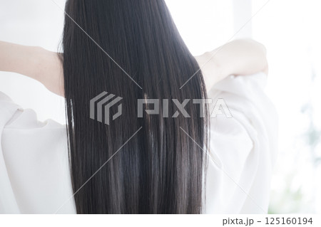艶のあるロングヘアの黒髪の女性の後ろ姿