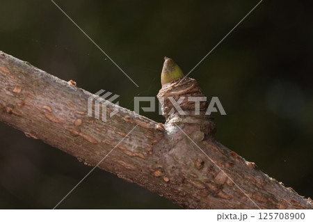 自然 植物 アカメガシワ、芽吹いた若葉は鮮やかな赤色ですが冬芽は灰色のモンスター風