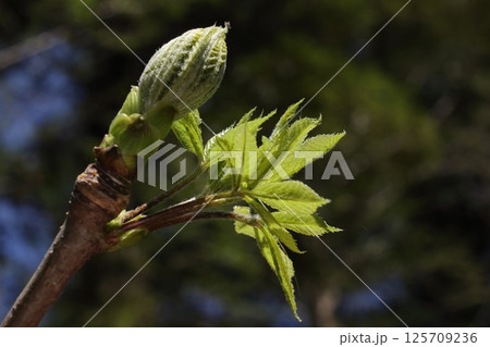 自然 植物 コシアブラ、芽吹きです。側芽は葉が展開していますが頂芽はこれから