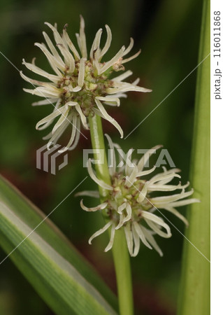自然 植物 ミクリ、雌花の花序のアップです。白色の紐状のものはそれぞれの花の数ミリもある柱頭