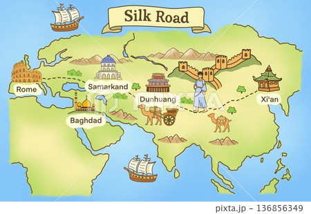 illustration of history and trading, Ancient Silk Road, silk trade with China, The Silk Road was a network of trade routes connecting China and the Far East with the Middle East and Europe