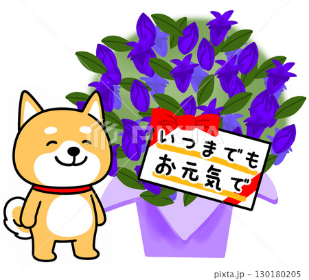 敬老の日に青いリンドウの花をプレゼントするしばいぬ