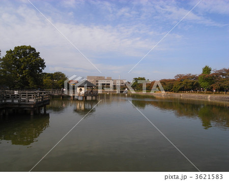長岡天満宮(長岡天神)の八条ヶ池に架かる橋の欄干越しに錦水亭が見える風景 京都府長岡京市
