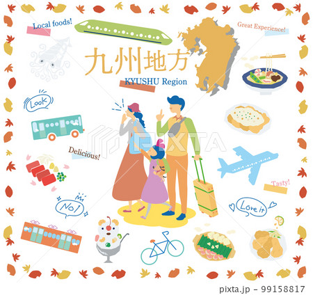 日本の九州地方の秋のグルメ観光を楽しむ観光客、アイコンのセット(フラット)