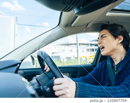 自動車の運転中に交通事故・追突事故をしそうになり急ブレーキをかけるアジア人のシニア男性