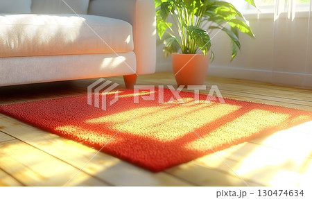 Cozy living room bathed in soft sunlight, highlighting a plush sofa and lush green plant