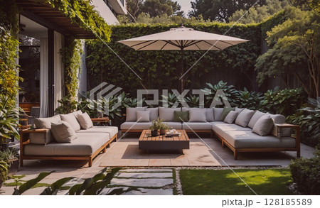 Large patio with a white umbrella and a lot of plants. The patio is filled with white furniture and has a lot of green plants