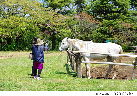 牧場の白馬と八重桜