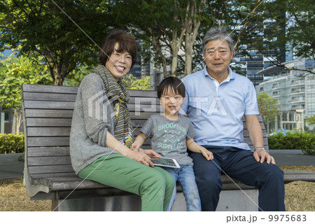 Grandparents and grandson sitting in a park in an asian city on a sunny day.