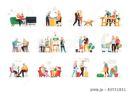 Elderly people hobbies. Seniors activities. Adult couples quiet pastime. Pensioners leisurely relaxing. Calm lifestyle. Grandparents travel and walk with dog. Vector elder persons set