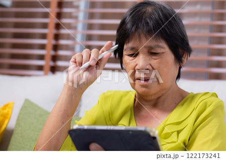 Senior asian woman sitting on sofa using digital tablet with relax in living room at home.