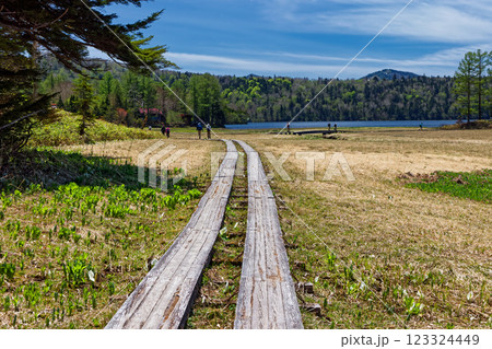 初夏の尾瀬沼・大江湿原を行くハイカー