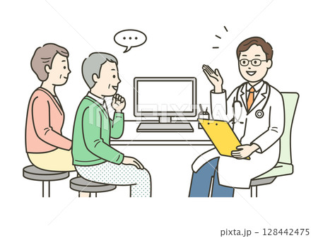 病院の外来で診察を受ける高齢男性と医師のイラスト