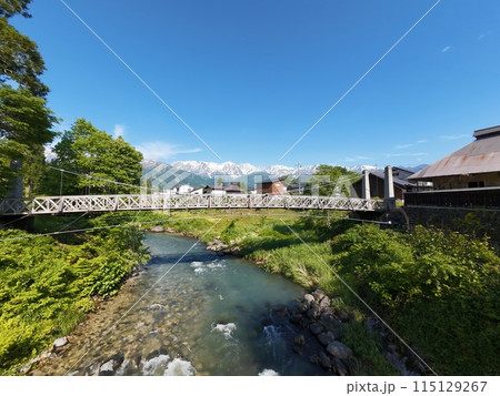 新緑の白馬 大出の吊り橋と残雪の白馬三山 長野県白馬村(ドローンによる空撮)