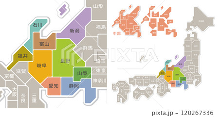 中部地方、中部地方の各県の地図、カラフルで明るい