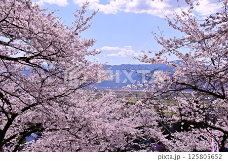長野県長野市篠ノ井東福寺 松代桜づつみ公園の桜と北アルプスの景色