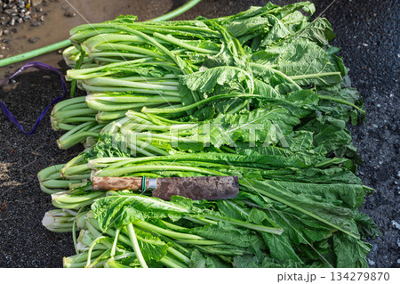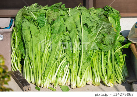 軒先でしんなりさせる収獲したばかりの野沢菜