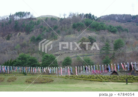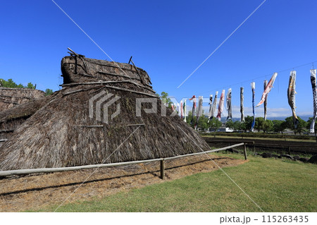 鯉のぼりがはためく、千曲市森将軍塚古墳館 科野の村 復元住居