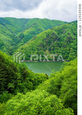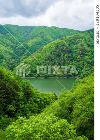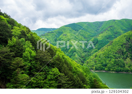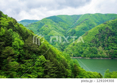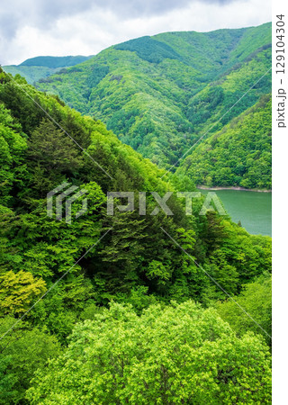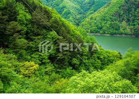 長野県道26号奈川木祖線から望む梓湖沿いの新緑