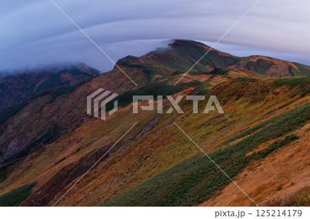 飯豊連峰・門内小屋から見る雲湧く紅葉の山並み
