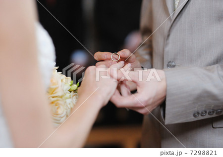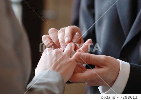 Groom putting a ring on brides finger