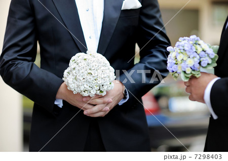 Groom and a bestman holding flowers