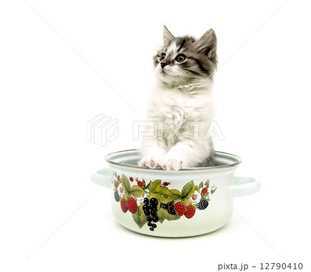 fluffy kitten sitting in a metal pan isolated over white backgro