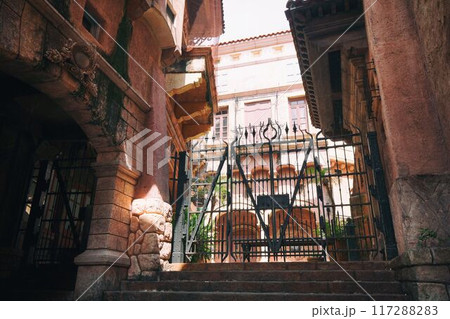 Narrowest cobblestone back street of Collonges-la-Rouge squeezed between 2 masonry walls.