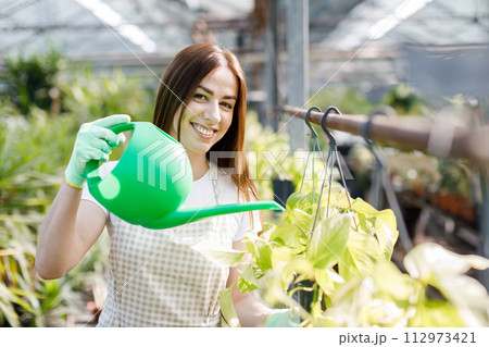 A young woman stands in the middle of a large greenhouse and pours pots from a watering can. The concept of caring for houseplants