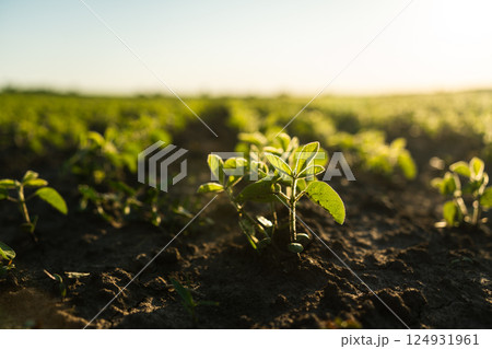 Close-up of young soybean sprouts grow in the field. Cultivation of soy bean plants. Small green soybean plants.