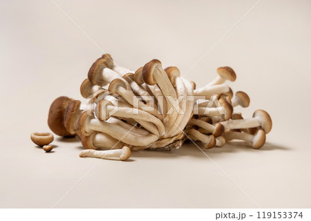 Fresh raw brown poplar mushrooms or velvet pioppini mushrooms on beige closeup