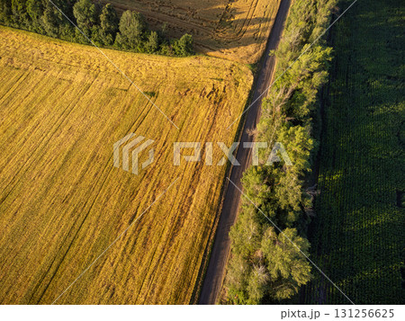 Countryside dirt road winding through cultivated fields, aerial shot top down