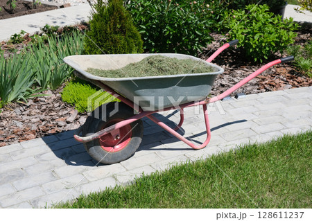 Mulching the topsoil on a vegetable bed with mowed grass from the lawn. production of biohumus organic fertilizer. Earth erosion.