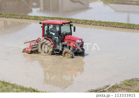 トラクターで代掻きをする風景 水田とトラクター 田植えの準備作業 農作業イメージ イメージ素材