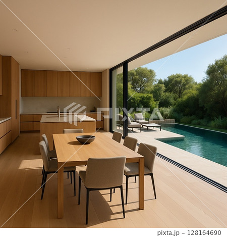 Natural light floods a modern interior with large windows and minimalistic design in a tranquil setting
