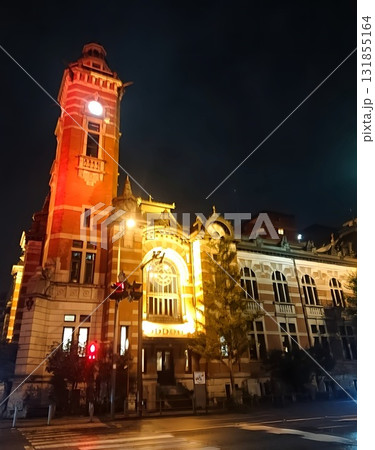 雨に濡れる横浜ジャックの塔・横浜開港記念会館の夜景
