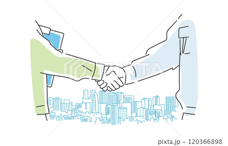都市を背景にした握手をする建設作業員のシンプルイラスト