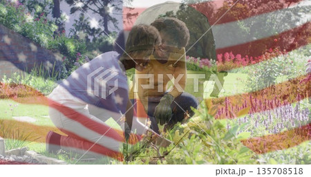 Showing camo helmeted soldier overlaying garden, with gardeners weeding under American flag overlay