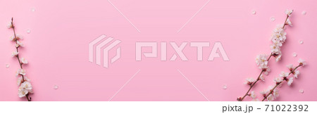 Spring composition of the twigs of flowering trees on a pink paper background.