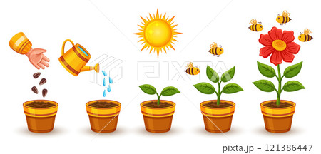 Flower plant growth stage, houseplant growing process, garden blooming herb life cycle set. Agriculture green sprout development process. Botanical evolution from seedling to blossom sapling vector