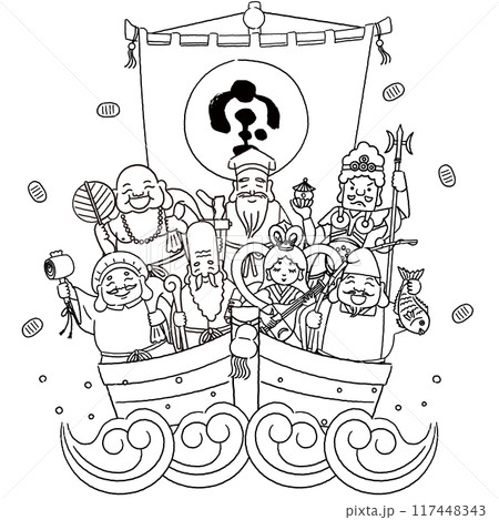 シンプルでかわいい七福神と宝船のイラスト(線画)