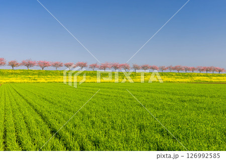栃木県小山市 思川沿いの間々田地区と乙女地区にまたがる思川桜堤 麦畑の先の桜並木と菜の花畑