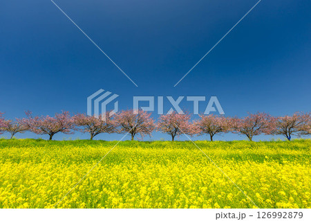 栃木県小山市 思川沿いの間々田地区と乙女地区にまたがる堤防に原産種の桜が続く思川桜堤の桜並木と菜の花