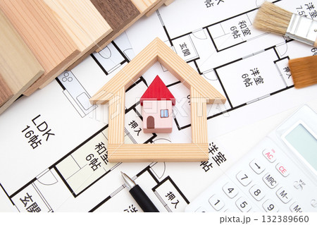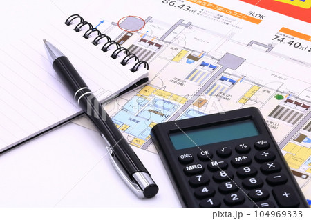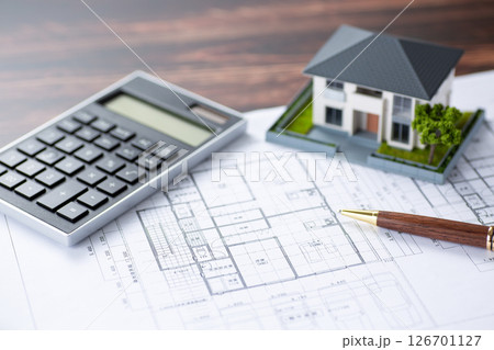 住宅図面と家と電卓