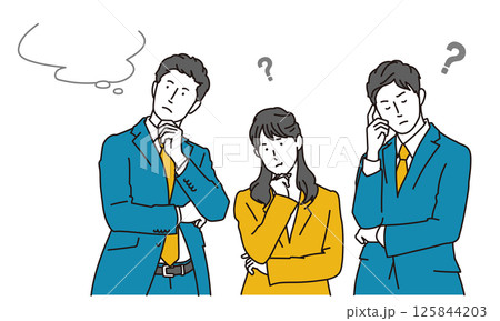 スーツ姿の男性と女性のシンプルな線画イラスト、困る表情とポーズのセット
