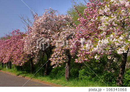 埼玉県川越市川越水上公園 ボート池の周りを彩る満開の八重桜の並木